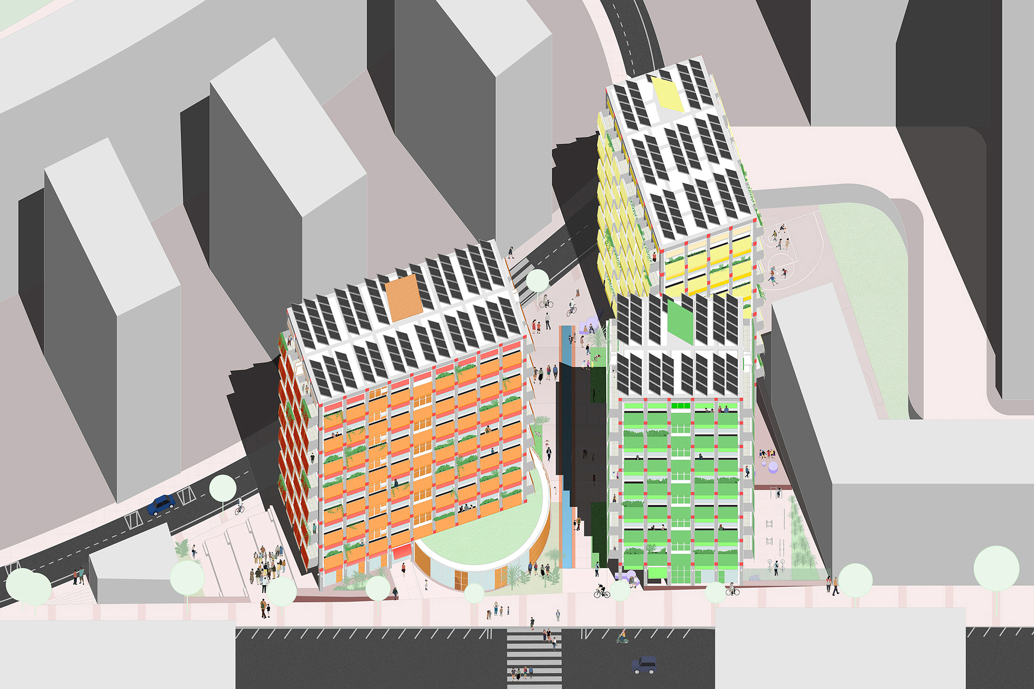 SOCIAL HOUSING for barcelona aims to foster inclusive, low-impact forms of cohabitation whilst transforming an underused piece of city, into a public space for all and 63 flats for the community. This is achieved through a generous civic square on the ground floor, as well as a hybrid system of modular prefabricated elements and on-site construction for the housing units above.