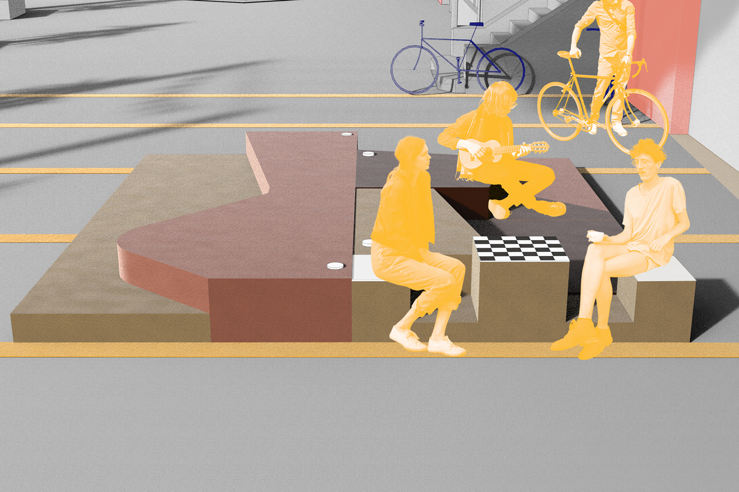 Our urban strategy breaks down the road into smaller scales activated through the acts of performing, playing, discovering and greening. These programmes suggest the transformation of the busy road into a welcoming street to pause and mingle. Ultimately the existing condition of non-welcoming spaces is subverted by our proposed catalogue of objects; seating, pedestals, raised platforms etc. which are designed to welcome people and allow them to sit and spend time in the area. These go beyond basic public furniture and way-finding exercises, and branch out into a broader strategy for the street which focuses on cultural curation, environmental comfort and events that re-invigorate and tell the story of the place.