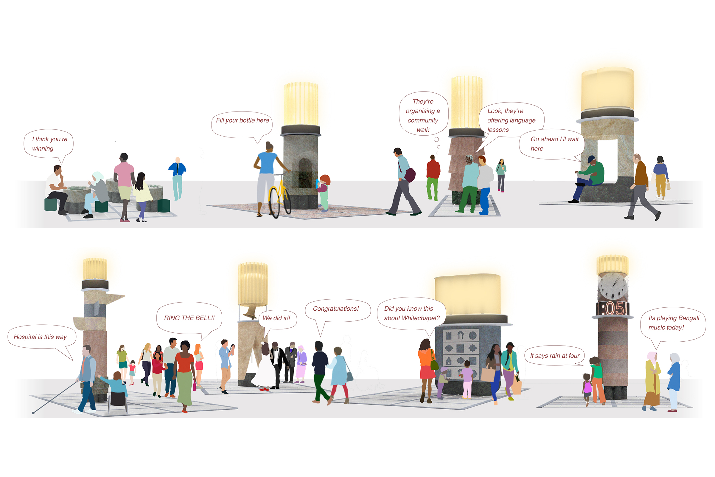 Gateways to Whitechapel Market is an urban strategy for the street that holds the market and the Tower Hamlets town hall, building upon rights to water, community, celebration, rest, orientation, and play.