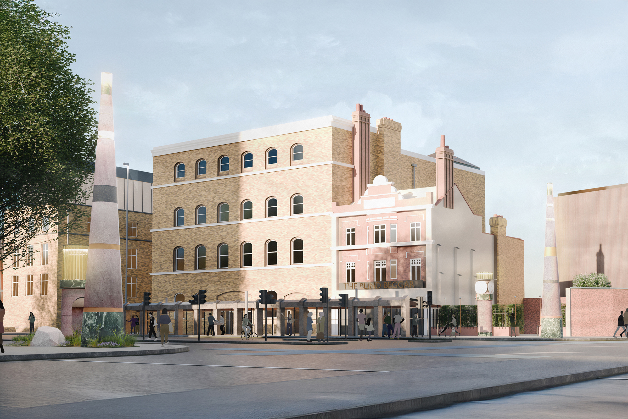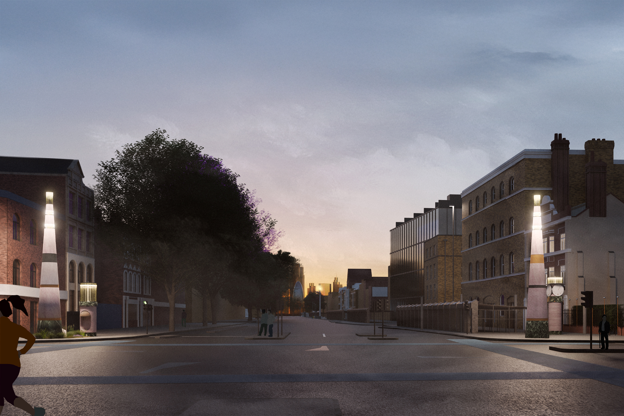2. BEACONS OF WHITECHAPEL, four new Manara ‘beacons of light’ frame the east and west gateways to Whitechapel Market. The iconography on them will capture the layered stories of Whitechapel, through the themes of Care, Resistance, Faith and Work. Outside Tower Hamlets Town Hall four similar, smaller beacons form a connected civic language, uniting these key transitions of the street.