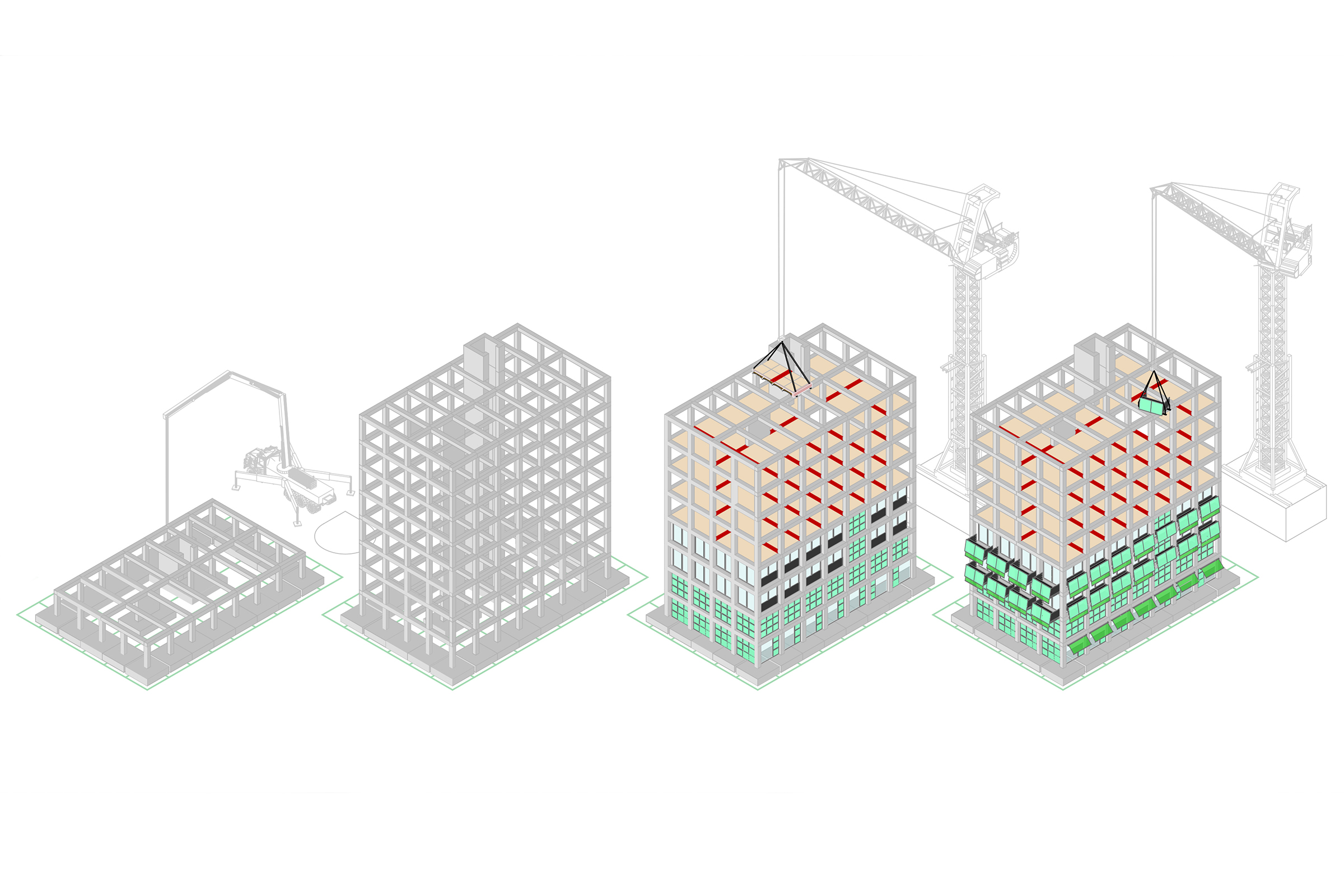 These repeated components, including modular floorplates, eliminate on-site fabrication and reduce cost and assembly time.